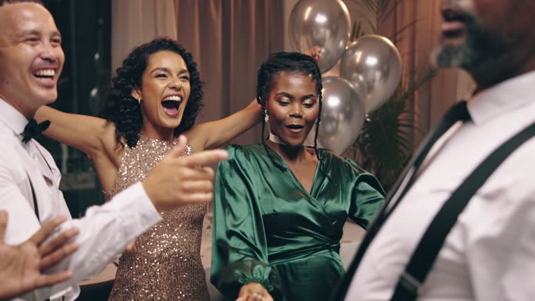 Business people, dancing and new year with confetti, cheers and party in night, happy and excited. Men, women and smile with sparkle, gold and silver glitter for cheers at gala, fashion or friends